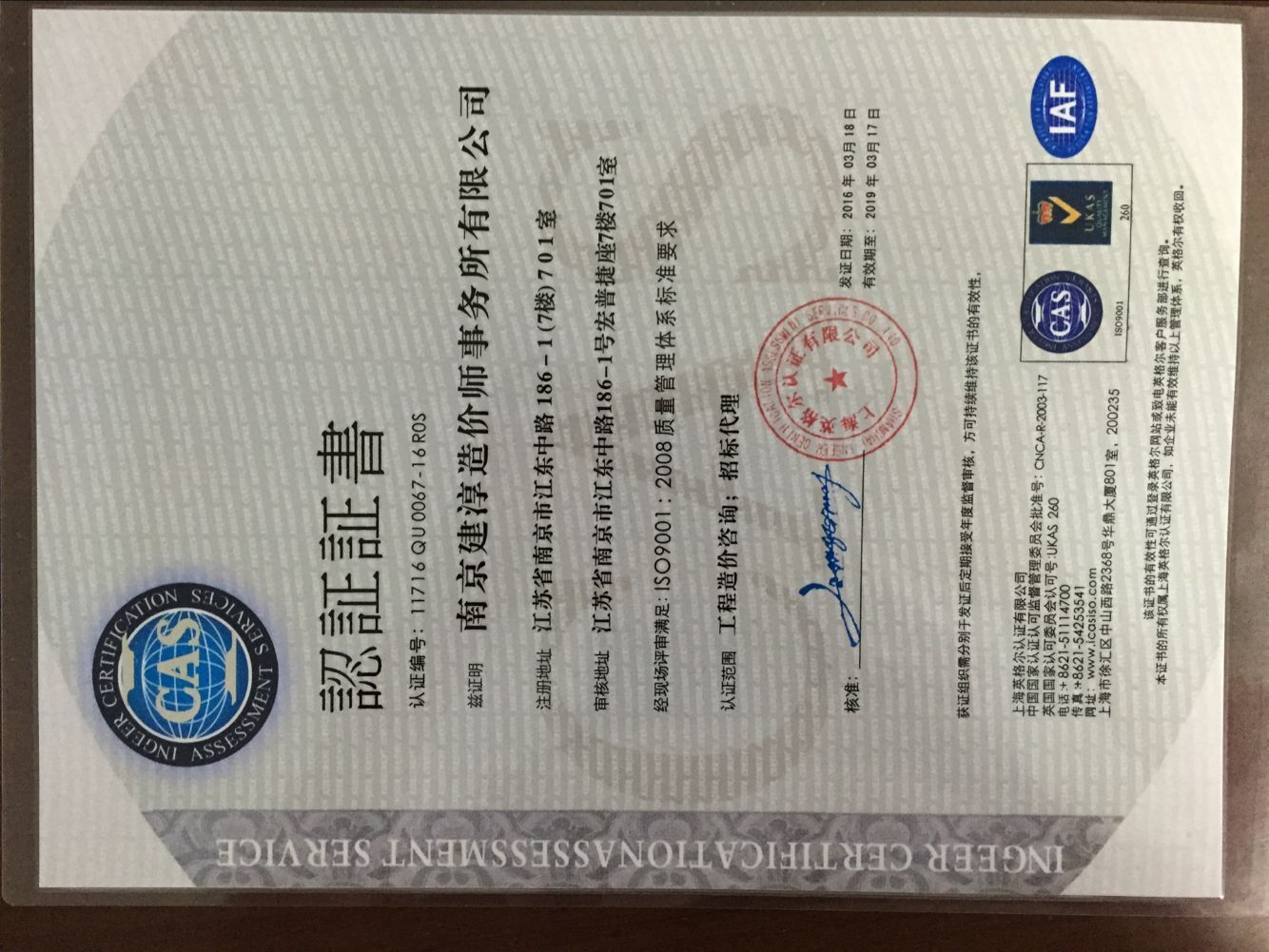 經(jīng)現(xiàn)場(chǎng)評(píng)審滿(mǎn)足:ISO9001:2008質(zhì)量管理體系標(biāo)準(zhǔn)要求 認(rèn)證范圍:工程造價(jià)咨詢(xún)、招標(biāo)代理 有限期至2019年3月17日【詳細(xì)】
